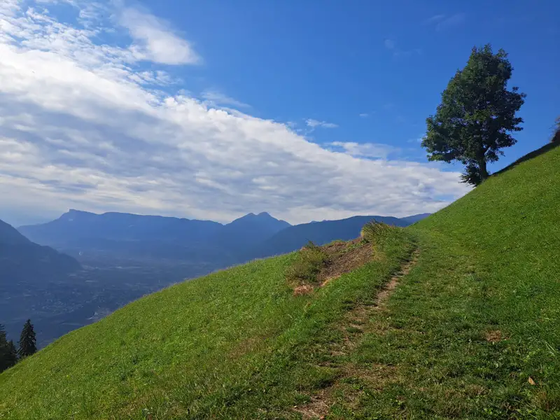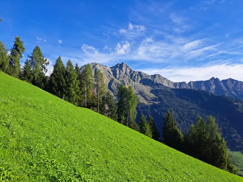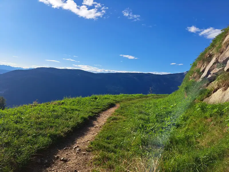 Der Weg führt in leichtem Auf und Ab entlang des sonnigen Hangs hoch über dem Vinschgau – ein sanfter Einstieg, der Lust auf mehr macht. Nach einer wohlverdienten Pause im Hochganghaus wandern wir weiter über die urige Tablandalm.