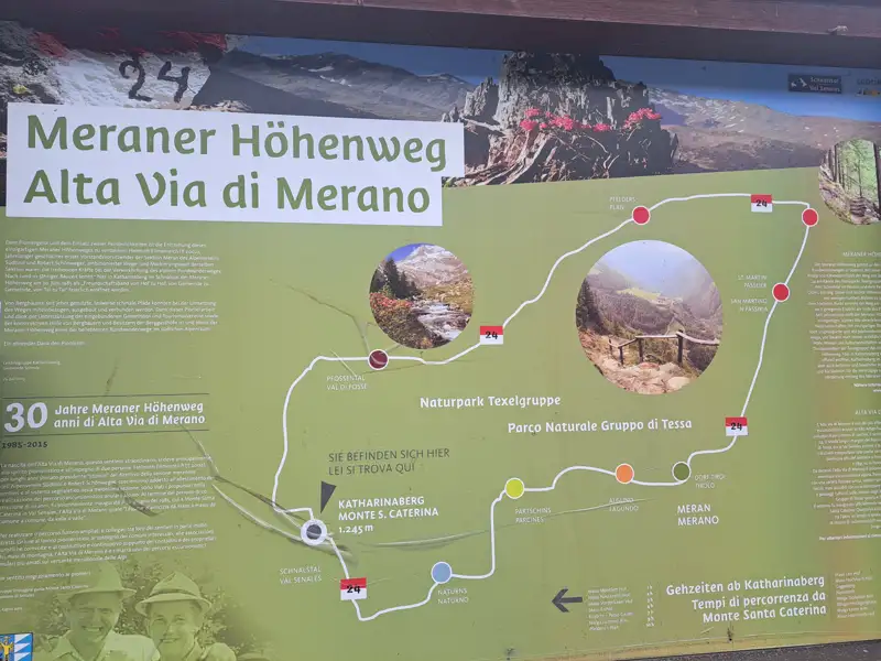 Mit einem letzten Blick über das weite Spronsertal und die Gipfel der Texelgruppe startet wir zu unserer letzten Etappe. Wir folgen dem Bockersteig, der uns auf den Tiroler Höhenweg führt. Nach wenigen Kilometern erreichen wir den Mutkopf (1.664 m) und gönnen uns am Berggasthaus eine Erfrischung mit Panoramablick. Wir steigen weiter ab, machen ein letztes Foto an der runden Aussichtsplattform am Gasthaus Steinegg, bevor mit der Hochmuthbahn ins Tal und zum Ausgangspunkt unserer Tour gelangen.