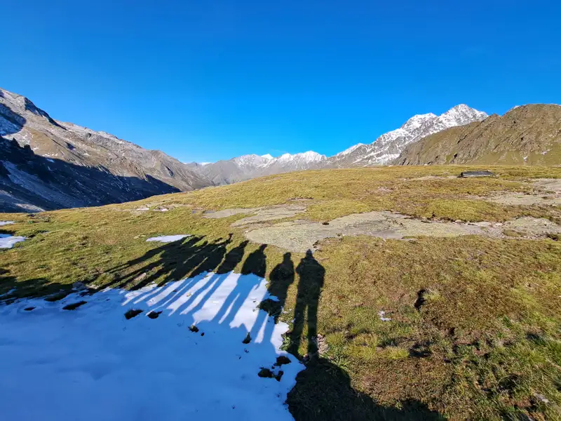 Heute erreichen wir den höchsten Punkt unserer Tour, das Eisjöchl auf 2.895 m. Mit der Morgensonne im Gesicht wandern wir entlang des Pfossentalbachs und genießen den Blick auf die Dreitausender der Ötztaler Alpen. Der alte Militärweg führt uns hinauf zum Eisjöchl, wo einst die Stettiner Hütte stand. Heute genießen wir unsere Mittagsrast in der etwas unterhalb gelegenen, neuen und umso moderneren Stettiner Hütte mit eindrucksvollem Panorama auf die Felswände des Ötztaler Hauptkamms. Am Ende unseres Abstiegs nach Pfelders gönnen wir uns noch kurze Rast in der Lazinser Alm, bevor die letzten Höhenmeter wie von selbst vergehen.