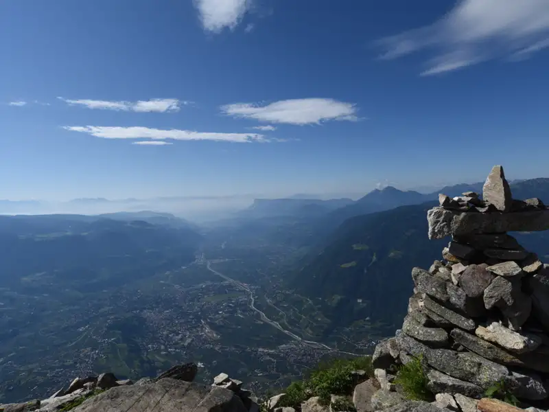 Wir treffen uns an der Talstation der Hochmuthbahn in Dorf Tirol und starten nach der Begrüßung durch unsere(n) Bergwanderführer(in) zu unserer heutigen, ersten Etappe. Unsere gemeinsame Wanderwoche beginnt mit einer Fahrt der Hochmuthbahn hinauf zu den Hochmuthhöfen, von wo sich uns ein grandioser Ausblick über die Dächer Merans hinweg bis nach Bozen eröffnet. Am Horizont entdecken wir auch die markanten Zacken der Dolomiten.