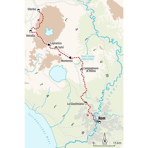 Von Sutri gelangen Sie über Felder und Wiesen bis nach Monterosi und zum Monti Gelato Wasserfall. Hier bietet es sich an, eine Mittagspause einzulegen. Bei gutem Wetter möchten Sie vielleicht ein erfrischendes Bad nehmen? Eine panoramareiche Straße führt Sie weiter zu den Stadttoren von Campagnano di Roma.