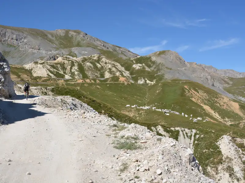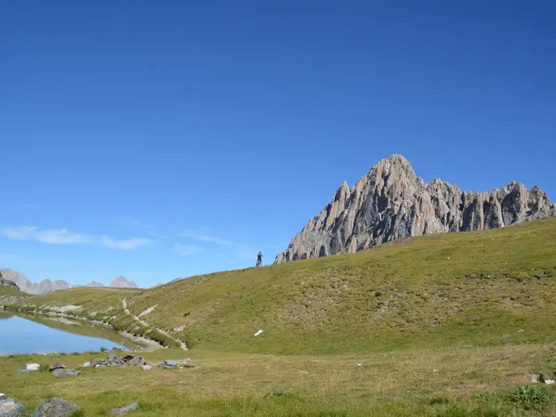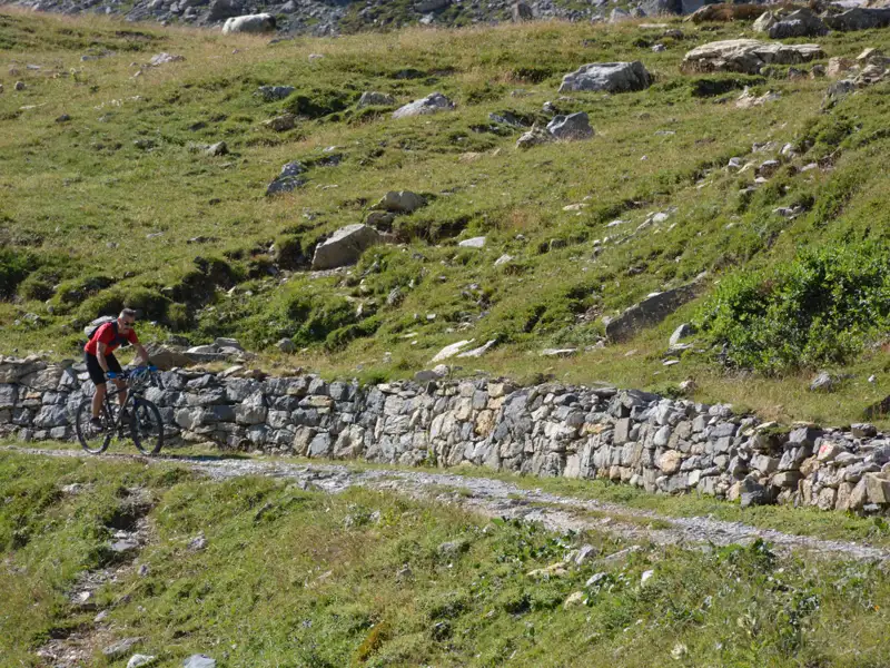 Der erste Teil der heutigen Tour führt entlang eines schmalen Asphaltstreifens. Wir erkunden das obere Grana Tal ausgehend von der eindrucksvollen Wallfahrtskirche San Magno und über den 2.500 Meter hohen Fauniera Pass. Nach ca.12 Kilometern beginnt ein Feldweg, der über die Hochebene von Bandìa-Gardetta führt, ein Erbe hochgelegener Militärstraßen. Der Untergrund ist einfach und kann sowohl mit dem klassischen MTB als auch mit dem E-Bike befahren werden. Das Plateau, das sich über ca. 15 km erstreckt, ist einzigartig in den Westalpen, und wir genießen vom Rad aus einsame Naturkulissen und historisches Erbe.