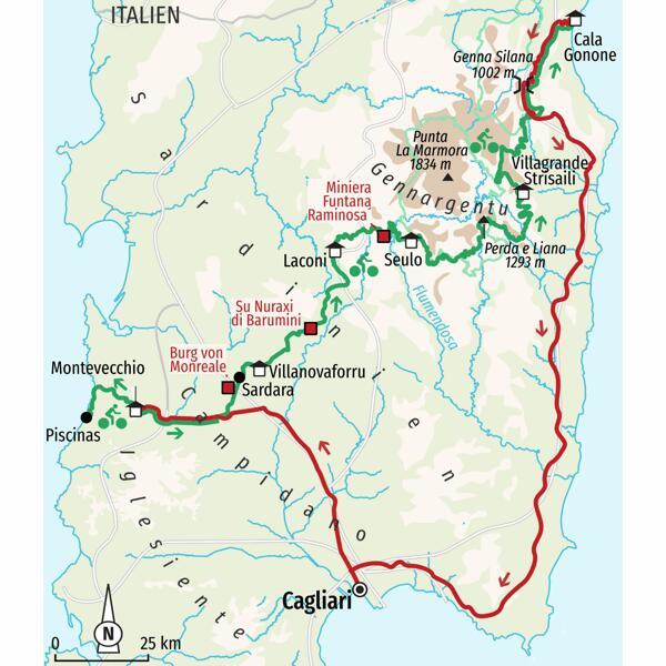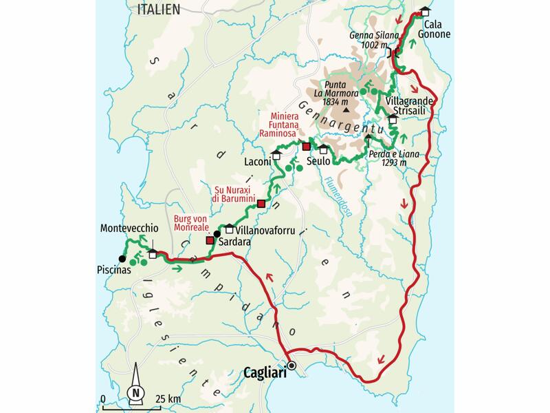 Freiheit auf 2 Rädern: Auf eigene Faust quer durch das Herz Sardiniens von West nach Ost. Kristallklares türkisblaues Meer an einsamen Buchten, uralte Korkeichenwälder und herbe Macchia, das urige Supramonte-Gebirge im Herzen der Insel, entlegene Bergdörfer und idyllische Fischerorte bilden die Kulisse dieser einzigartigen Bikewoche. Per Rad erkunden Sie die überaus vielfältige Landschaft der Insel mit immer neuen Facetten. Weiße Strände, pinkfarbene Bougainvilleen und gelb leuchtender Ginster geben der kargen mediterranen Landschaft ihre Farbe. Einsame Schotterstraßen und verschlungene Maultierpfade führen Sie abseits der klassischen Routen von der Ostküste aus durchs wilde Hinterland der Insel, begleitet von Olivenhainen und Weingärten und Ausblicken auf die herrliche Küste. Nur ab und zu treffen Sie auf sardische Hirten oder Förster, Ziegenherden kreuzen Ihren Weg. Mittags rasten Sie im Schatten der Bäume oder kehren in kleinen Dörfern zum Aperitif ein. Einer der Höhepunkte ist die lange herrliche Abfahrt aus den Bergen hinab zum in der Sonne glitzernden samaragdgrünen Golf von Orosei. Weit in der Ferne lockt bereits die feinsandige Bucht zum erfrischenden Sprung ins Wasser. Die Vielfalt Sardiniens bietet alles, was das Bikerherz begehrt. Herrliche Naturschätze, gepaart mit italienischer Lebensart und traditioneller sardische Hausmannskost - frischer Pasta, würzigem Pecorino und natürlich sardischem Rotwein. Bella Vita in Italien!