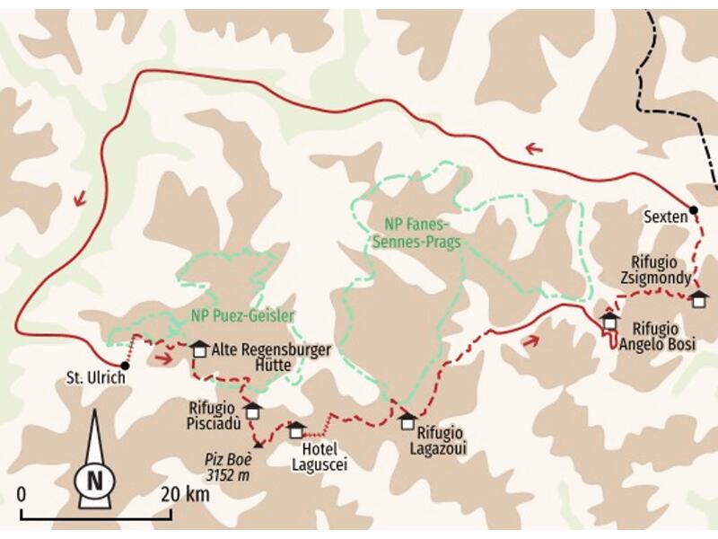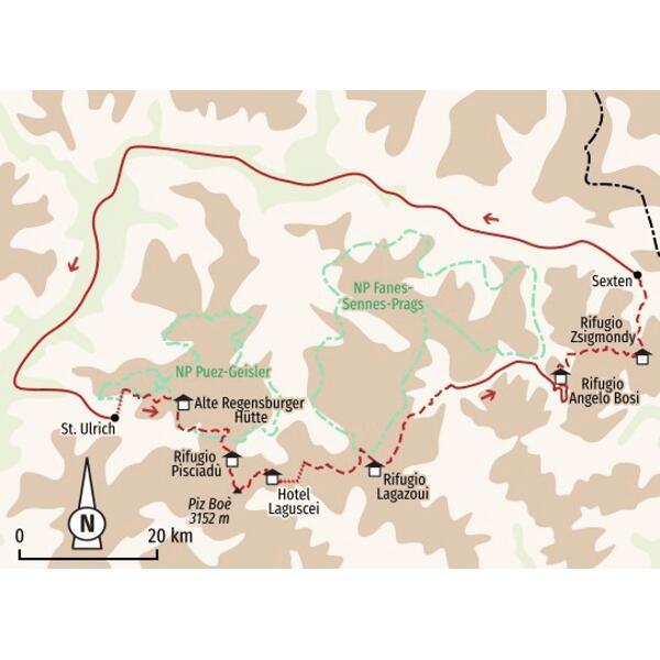 Unsere Dolomitenwoche von der Seceda zu den Drei Zinnen bringt uns an den landschaftlichen Höhepunkten der Dolomiten vorbei, zu ganz besonderen Plätzen in diesem so faszinierenden Teil der Alpen. In ausgewählten alpinen Unterkünften werden wir kulinarisch verwöhnt und befinden uns doch an einsamen Orten hoch oben, wo wir nachts unter dem Sternenhimmel die Ruhe der Berge genießen können. Von West nach Ost durchqueren wir neben bekannten Bergmassiven wie der Geisler, der Sella und des Lagazuoi vor allem einsame Regionen, bevor wir an den Drei Zinnen die wohl spektakulärste Landschaft der Alpen passieren.