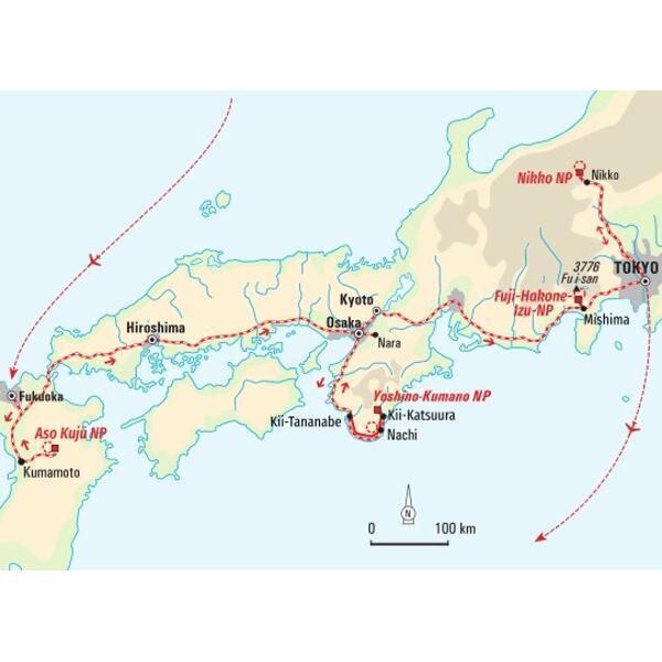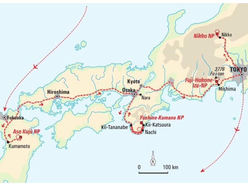 Die wärmenden Strahlen der Sonne treffen unsere Haut und lassen den Fuji in einem magischen Licht erstrahlen. Aber nicht nur Ausblicke, sondern auch Einblicke sind in Japan rundum begeisternd. Wir wandern durch die Lavawüste des gewaltigen Aso-Kraters, lauschen dem tosenden Wasserfall in Nachi und folgen den alten Pilgerpfaden in die dichten Wälder Kumanos. Wir tauchen ein in die Kultur des Buddhismus und Shintoismus, bestaunen den Itsukushima-Schrein von Hiroshima, bewundern die mächtige Statue des kosmischen Ur-Buddha in Nara und genießen die spirituelle Atmosphäre am Tempel in Daisho-In. Aber auch architektonisch hat der Inselstaat an Vielfalt die Nase vorn: Die mächtige Burg von Kumamoto, das größte Holzgebäude der Welt Tōdai-ji und die gläsernen Wolkenkratzer von Tokyo gehören ganz selbstverständlich zu Japan. Genau wie die urigen Bergsiedlungen und die lebendigen Fischerdörfer an der Küste, wie akkurat gepflegte Zen-Gärten und verwilderte Waldpfade, und wie gemütliche Nahverkehrsbahnen und der pfeilschnelle Shinkansen Schnellzug. Nach den Wanderungen durch die Natur lockt ein heißes Bad im Onsen, nach dem Streifzug durch den Großstadtdschungel ein kühles Bier. Japan, das "Land der aufgehenden Sonne" strahlt im Glanz der Tradition und leuchtet in die moderne Zukunft.