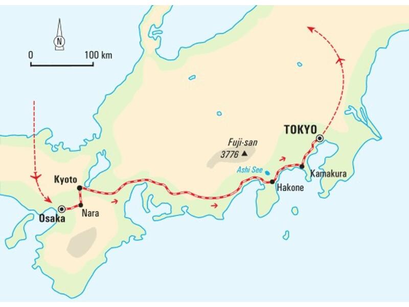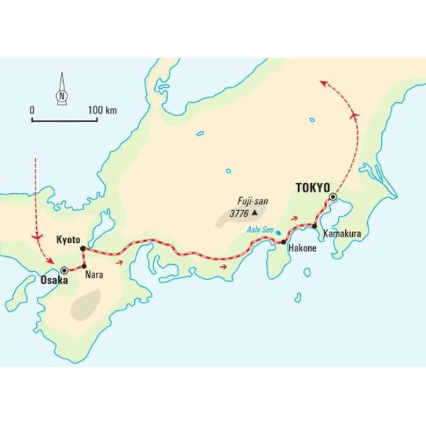 Auf den ersten Blick ist Japan rot. Rote Torii, rote Schreine, rote Siegel, rote Postkästen und die rote Sonne der Nationalflagge. Bei genauerer Betrachtung wird aber klar, dass der Inselstaat in Wahrheit kunterbunt ist. Ein Meer aus Farben und Färbungen, ein Land voller Fakten und Gegensätze. Schlichte Zen-Ästhetik trifft auf blinkende Leuchtreklame, stille Teezeremonien konkurrieren mit singenden Getränkeautomaten, futuristische Roboter agieren neben traditionellen Ryokans. Genauso farbenfroh wie Natur und Architektur sind auch Geschmack und Geschmäcker: Frittierte Bienenlarven, Thunfisch-Eis, Schoßhündchen im Kimono, tiefe Verbeugungen beim Telefongespräch – das kulturelle Erbe lebt unter der Oberfläche der Moderne weiter und Geschichte und Gegenwart verschmelzen in Japan zu einer exotisch-dynamischen Einheit. Wir wandern auf dem Yamanobe-no-michi, dem ältesten Weg Japans, und lassen uns von den Farben der Kirschblüte oder des Herbstlaubes inspirieren. Wir streifen durch den dunkelgrünen Zedernwald im Norden Kyotos und erkunden den blühenden Nara-Park. Wir düsen mit dem weißen Shinkansen in Windeseile ans blaue Meer, gleiten mit dem Boot über den türkisfarbenen Ashi-See und nehmen die Seilbahn zum Fuß des Kami-Kraters. In Nara widmen wir uns den vergoldeten Statuen, in Yoshino den heiligen Schreinen und in Kamakura den buddhistischen Tempeln. Im Fuji-Hakone Nationalpark dominiert der Fuji mit seiner Schneekappe die Kulisse und wir genießen den Anblick, bevor wir uns in den Großstadtdschungel Tokyos stürzen. Japan – ein kunterbuntes Potpourri der Kontraste.