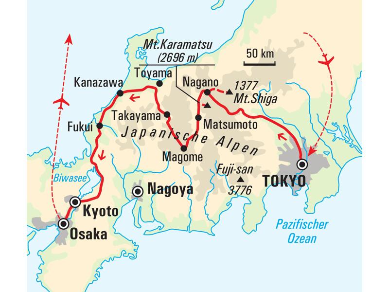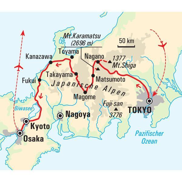 Wir wandern durch duftende Zedernwälder und rauschende Bambushaine, wir folgen alten Pilgerpfaden und traditionellen Handelswegen und steigen auf den aussichtsreichen Gipfel des Karamatsu-Dake. Auf dem "Ikemeguri-Nature-Trail" in der Shiga-Hochebene folgen wir den vom Herbstlaub gefärbten Alleen, auf der historischen Salzstraße "Shio No Michi" den zahlreichen Buddha-Skulpturen und auf dem "Nakasendo-Trail" den Spuren der Samurai durch die Berge. In Matsumoto besuchen wir die imposante Krähenburg, in Magome das historische Teehaus und in Takayama die Sake-Brauereien in der Altstadt. Neben den verschlafenen Dörfern des Hinterlandes erleben wir in den Städten den vollen Kontrast: Der Geist der alten Zeit flattert noch immer durch die buddhistischen Tempel und Shinto-Schreine von Kyoto, die Moderne strahlt uns in den futuristischen Gebäuden und knalligen Leuchtreklamen von Tokyo entgegen. Wir lernen mit Norbert die Gesichter Japans kennen, genießen Einblicke in tief verwurzelte Traditionen und Ausblicke auf die Technik der Zukunft. Und dabei verfallen wir ganz sicher dem Charme der Gegensätze.