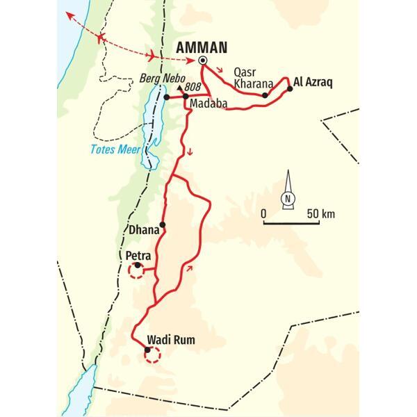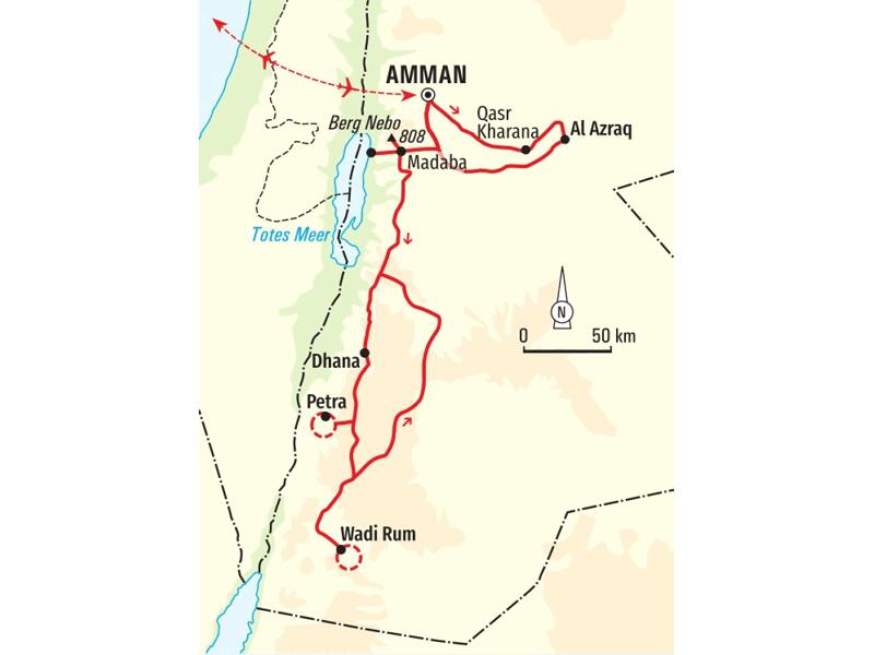 Der Fokus dieser Reise liegt auf den kulturellen und landschaftlichen Highlights des Landes kombiniert mit einfachen Wanderungen. Die berühmte Felsenstadt Petra, UNESCO-Weltkulturerbe, ist genauso Bestandteil dieser Reise wie die Wüstenschlösser im Nordosten des Landes sowie das Feuchtgebiet Azraq, welches einen Kontrast zur ansonsten felsigen und sandigen Landschaft bietet. Wadi Rum im Süden und das Tote Meer dürfen ebenfalls nicht fehlen.