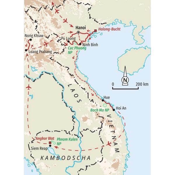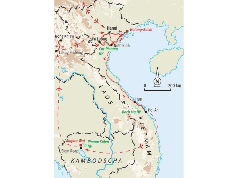 Der Fokus dieser Reise liegt auf einer Kombination aus Wandern und Erleben, die uns sowohl die beeindruckende Natur als auch das kulturelle Erbe Vietnams, Laos und Kambodschas näher bringt. Bei dieser Reise wird der Norden Vietnams mit Hanoi und Halong Bucht, Zentralvietnam, der Norden Laos mit Luang Prabang sowie Siem Reap mit Angkor Wat in Kambodscha besucht. Sie gibt somit einen sehr guten Einblick in alle drei Länder. Es bleibt zudem viel Zeit für Begegnungen mit Einheimischen und Einblicke in die Traditionen der einzelnen Länder sowie in die unvergleichliche kulturelle Vielfalt.