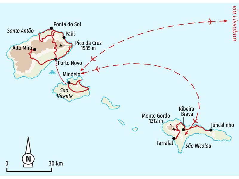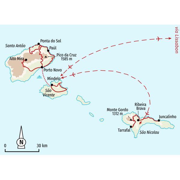 Der Fokus dieser Reise liegt auf den Nordinseln der Kapverden: Die Naturparadiese der Inseln São Nicolau und Santo Antão mit der kulturellen Hafenstadt Mindelo auf der Insel São Vicente. Vier Tage lang erkunden wir die touristisch noch nahezu unberührte Insel São Nicolau mit der entspannten Kleinstadt Ribeira Brava. Anschließend geht es weiter ins Wanderparadies Santo Antão, der zweitgrößten und vielleicht spektakulärsten Insel der Kapverden. Auf Maultierpfaden wandern wir entlang der Steilküste und durch tropisch-grüne Täler, umgeben von einer unglaublichen Bergkulisse. Am Anfang und Ende der Reise legen wir jeweils einen kurzen Zwischenstop in Lissabon ein und genießen das Flair der portugiesischen Metropole.