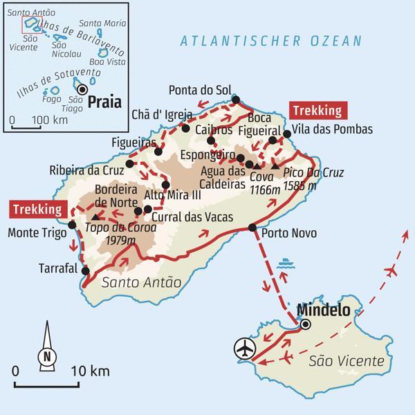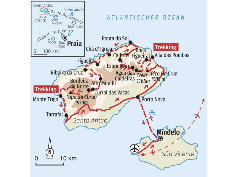 Der Fokus dieser Reise liegt auf dem 10-tägigen Trekking über die Insel Santo Antão. Das Trekking führt uns vom fruchtbaren Nordosten über Ponta do Sol an der Küste entlang in die Hochebene von Norte zum trockenen, einsamen Westen der Insel. Wir bewegen uns teilweise in touristisch wenig erschlossenen Regionen, die nur zu Fuß erreichbar sind. Zu Beginn der Reise erkunden wir auf der Insel São Vicente die Kulturhauptstadt Mindelo.