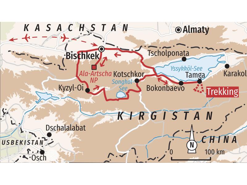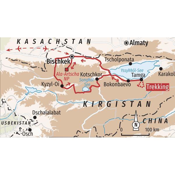 Nomaden ziehen mit ihren Herden über die Sommerweiden, um uns herum ragen die Berge des Tienschan in den Himmel. Flüsse und Seen glitzern in der Sonne, der Wind trägt den Duft von Steppenkräutern zu uns heran. Kirgistan weckt wie kaum ein anderes Land ein Gefühl von Freiheit. In der Hauptstadt Bischkek beginnt unsere Reise. Wir stöbern durch die vielen, bunten Waren auf dem Osch-Basar und spazieren über prächtige Plätze, die an die Sowjetvergangenheit des Landes erinnern. Statt orientalischem Flair steht im Ala-Artscha-Nationalpark das Naturschauspiel im Mittelpunkt. Wir halten Ausschau nach Bergziegen, Murmeltieren und Pikas und erfrischen uns am rauschenden Ak-Sai-Wasserfall. Im Bergdorf Kyzyl-Oi genießen wir die kirgisische Gastfreundschaft und bestaunen die umliegende Berglandschaft – Rot, Braun und Grün sind die vorherrschenden Farbtöne. Weiter östlich erreichen wir den Gebirgssee Songköl. Wir übernachten in Jurten, die wie kleine Inseln in der offenen, weiten Landschaft stehen und lernen bei Fladenbrot und dem Reisgericht Plov den Nomadenalltag näher kennen. Südlich des azurblauen Yssykköl, mit seinen feinen Stränden, geht es dann hinein in den Terskej-Alatau, einem Teilgebirge des Tienschan. Wir trekken vom Ort Tamga über das Tosor-Tal bis zur Barskaun-Schlucht, überqueren dabei Pässe, furten Flüsse und schlagen unser Camp stets in der wilden Landschaft auf. Nach dem Trekking entspannen wir am Yssykköl, bevor die Reise zurück in Bischkek ihr Ende findet. Kirgistan – die Kultur des Orients und wilde, ungezähmte Landschaften berauschen die Sinne gleichermaßen.