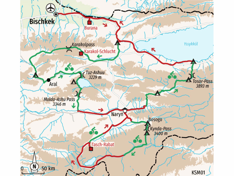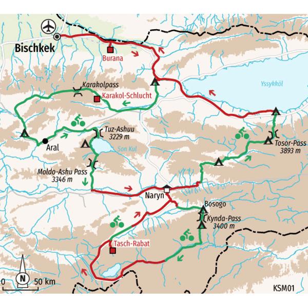 Heute radeln wir in Serpentinen und in mäßigem Anstieg über den Moldo-Ashu Pass (3346 m) und haben bei Schönwetter die Gelegenheit für lohnende Fotostopps. Ein schöner Ausgleich zum kalten Wind, der uns hier meist ins Gesicht bläst. Es geht durch eine offene, von Bergen eingerahmte Graslandschaft bergauf. Vom Pass aus bieten sich tolle Ausblicke auf das vor uns liegende Tal. Dort führen graue, von Nadelbäumen bewachsene Felsen Regie. Die Piste windet sich in vielen Serpentinen den Berg hinab, das Tal weitet sich, die Vegetation wird deutlich karger. Die Berge werden flacher und welliger, zum Grau gesellen sich Rot- und Brauntöne. Nach dem Mittagessen steigen wir ins Auto um und fahren auf einer asphaltierten Straße nach Naryn an der alten Seidenstraße. Das Naryn-Tal ist eine weite, grüne Ebene, durchflossen vom Fluss Naryn und umrahmt von fast weißen, von Erosion geformten Bergen. Die Stadt liegt zu beiden Seiten des gleichnamigen Flusses, der in einer malerischen Schlucht durch den Ort fließt. Auf ca. 2050 m ist Naryn als die kälteste Stadt Kirgistans bekannt. Nach dem Check-In im Hotel bleibt noch ein wenig Zeit zum Ausruhen, bis wir in einem lokalen Gasthaus unser Abendessen einnehmen.