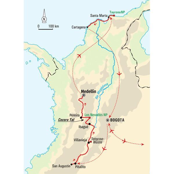Der Fokus dieser Reise liegt auf Wanderungen in der abwechslungsreichen Natur Kolumbiens, sowohl in der Mitte des Landes rund um Bogotá als auch im Norden an der Karibikküste. Dabei erkunden wir die Hauptstadt Bogotá und die umliegende Region mit kleinen kolonialen Städten, der Kaffeezone, archäologischen Stätten und landschaftlichen Highlights wie der Tatacoa-Wüste. An der Karibikküste entdecken wir die Traumstrände im Tayrona-Nationalpark und die bunte Kolonialstadt Cartagena.