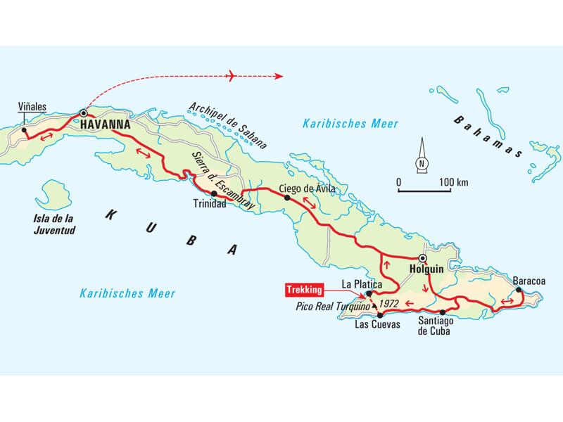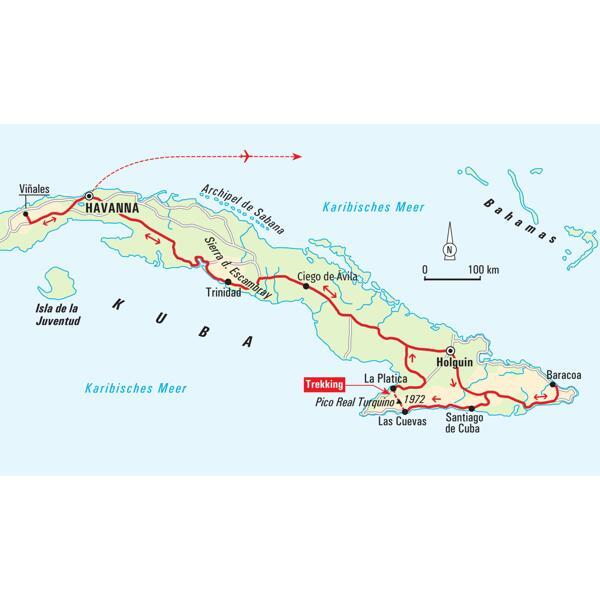 Der Fokus dieser Reise liegt auf den Highlights Kubas sowie einem viertägigen Trekking in der Sierra Maestra im Osten der Insel, mit Besteigung des Pico Turquino (1.974 Meter). Die Rundreise verläuft über die komplette Insel von Osten nach Westen und kombiniert die wichtigsten Orte und Sehenswürdigkeiten mit Wanderungen durch die verschiedenen Landschaften. Somit hat man die Gelegenheit die Geschichte, Kultur, Landschaft sowie kubanische Lebensfreude kennenzulernen.