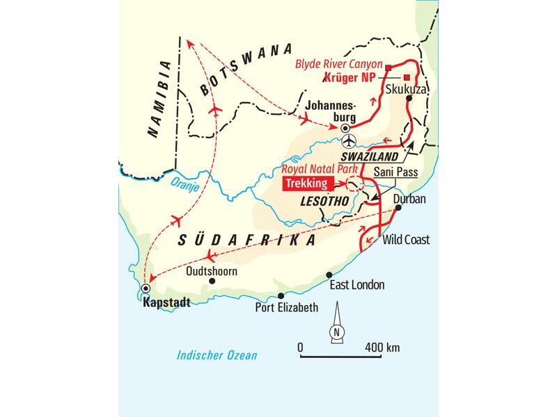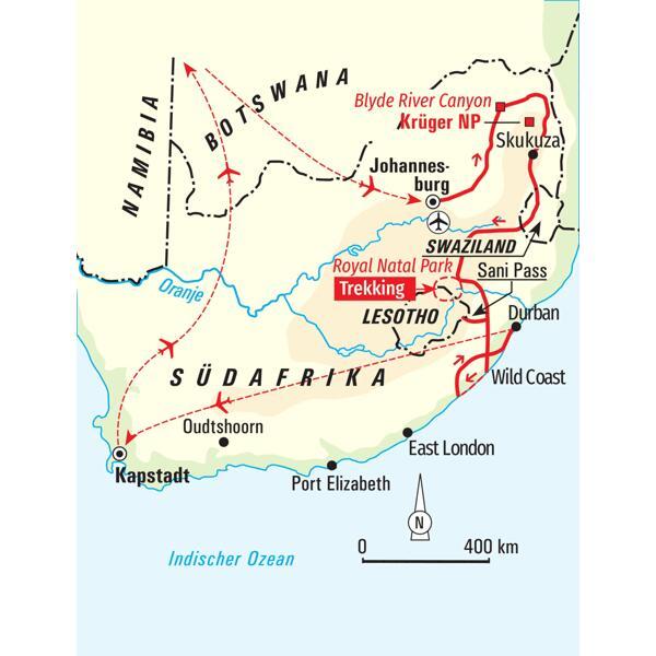 Der Fokus der abwechslungsreichen Trekking- und Wanderreise liegt auf den Wander-Höhepunkten Südafrikas. Wir sind auf Safari im berühmten Krüger-Nationalpark, überqueren die Drakensbergen, wandern entlang der "Wild Coast" am Indischen Ozean und entdecken schließlich die Kap-Region am Atlantischen Ozean zu Fuß.