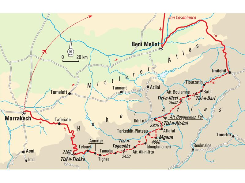 "Imazighen" bedeutet in der Sprache der Berber "Die Freien" – so bezeichnen sich die Halbnomaden selbst. Während der großen Atlas-Durchquerung lernen wir dieses besondere Freiheitsgefühl zu verstehen. 16 Tage wandern wir auf und ab - fernab von Touristenströmen - durch den wilden, wenig frequentierten, östlichen Hauptkamm des Hohen Atlas. Gurgelnde Bäche, zerklüftete Bergflanken in verschiedenen Erdtönen und dramatisch tiefe Schluchten wechseln sich ab mit kahlen Hochgebirgshängen, an denen Zedern in den Himmel ragen und Bergkamele weiden. Neben dem Naturerleben gewinnen wir ein authentisches und unverstelltes Bild des hier lebenden Berberstammes der Ait Haddidou, deren reiche Kultur weit vor die Zeit der Islamisierung Nordafrikas reicht. Am Ende unseres Trekkings erreichen wir die Kleinstadt Telouet. Die Kasbah thront über dem Dorf und überrascht uns mit prunkvollem Interieur, das wir beim Anblick von außen nicht erwarten würden. Über den Tizi n' Tichka, die höchste Passstraße Marokkos, fahren wir zurück nach Marrakech, wo wir zum Abschluss unserer Reise bei einer Stadtführung die alte Medina mit ihren schier endlosen Waren und herrschaftlichen Palästen erkunden. Diese Reise ist für Trekkingliebhaber konzipiert, die durch authentische Begegnungen Ihren Horizont erweitern und gleichzeitig zu sich kommen möchten – Slow Trekking in Reinform!