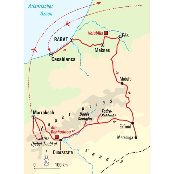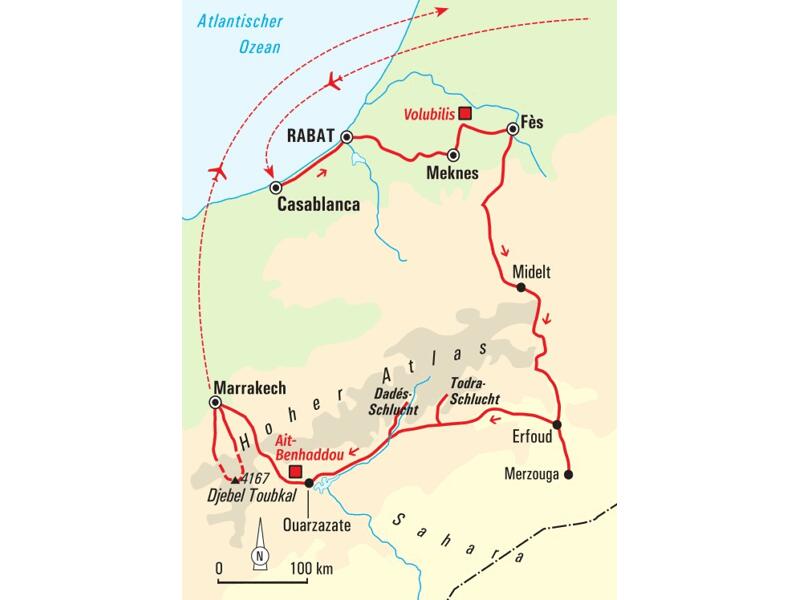 Der Fokus dieser Reise liegt auf dem Besuch der 4 Königsstädte, Rabat, Meknès, Fés und Marrakech, einem Abstecher in die Sahara zu den Dünen des Erg Chebbi und auf dem 4-tägigen Trekking im Hohen Atlas, wo wir die Möglichkeit haben, den höchsten Berg Nordafrikas, Jebel Toubkal, zu besteigen.