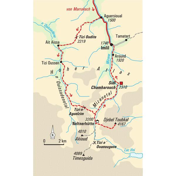 Wir brechen früh auf, noch vor den ersten Sonnenstrahlen. Der Weg ist nicht ausgesetzt, führt aber manchmal über loses Geröll und Blockgestein. Bis in den Frühsommer ist mit der Querung von Schneefeldern zu rechnen. Bei der Gipfelrast schweift unser Blick bei guter Sicht bis in die südmarokkanische Wüstenebene hinunter und auf die 4.000er-Kämme um uns herum. Nach dem Abstieg erreichen wir wieder unseren Lagerplatz, wo unser Koch mit einem Mittagessen auf uns wartet. Der weitere Nachmittag steht zur freien Verfügung. Wer am Gipfelaufstieg nicht teilnehmen möchte, kann gemütlich das Hochtal zwischen den schroffen Bergkämmen durchstreifen oder der Aussicht wegen über einen gut begehbaren Weg zum Tizi-n-Ouanoums (3.700 m) oder Tizi n´Ouagane (3.800 m) wandern.
