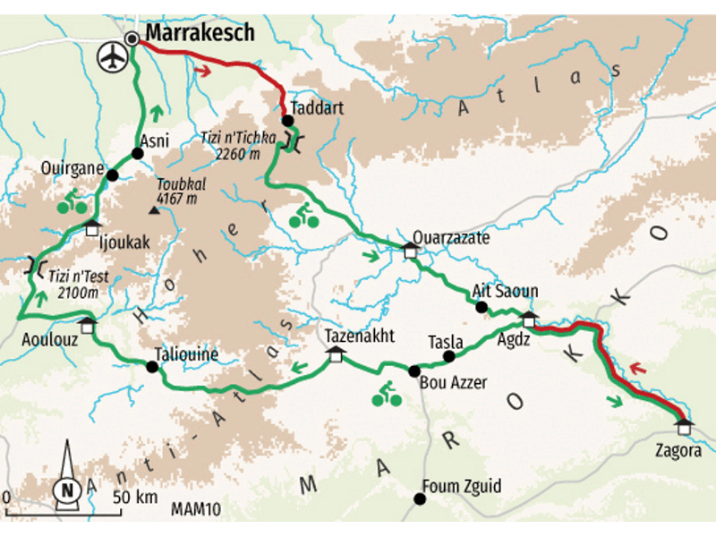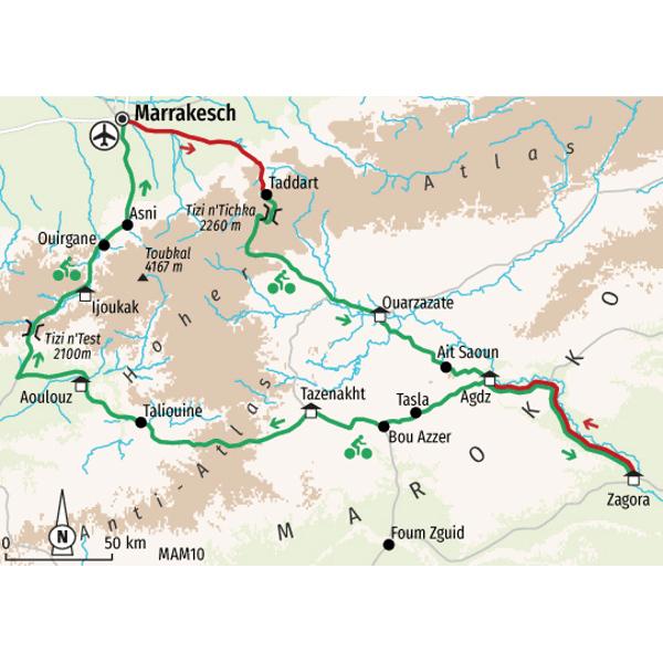 Wir verlängern die Bike-Saison in der Wintersonne Marokkos! Zwischen den schneebedeckten Gipfeln des Hohen Atlas im Norden und der Sahara im Süden ist das Klima außerhalb der europäischen Sommermonate auf dieser Route perfekt zum Biken. Das ganze Spektrum marokkanischer Höhepunkte erwartet uns. Entlang des Hohen Atlas biken wir auf guten Asphaltstraßen über den Tizi n'Tichka-Pass (2.260 m) bis zur Wüstenstadt Zagora und rund um den schneebedeckten Toubkal (4.167 m), den höchsten Berg Nordafrikas. Die Kulisse der Tour bilden traditionelle, im Abendlicht rot leuchtende Kasbahs und üppige Palmenoasen im Draa-Tal, ursprüngliche Berber-Dörfer und das einsame Jebel Sarhro-Gebirge am Rand der Sahara mit seinen spektakulären Felsformationen. Das orientalische Flair auf dem Markt in Marrakesch bildet den krönenden Abschluss. Wir genießen die Magie Marokkos, den "Thé á la Menthe" und die Gastfreundschaft der Berber auf dieser ganz besonderen Roadbike-Tour!
