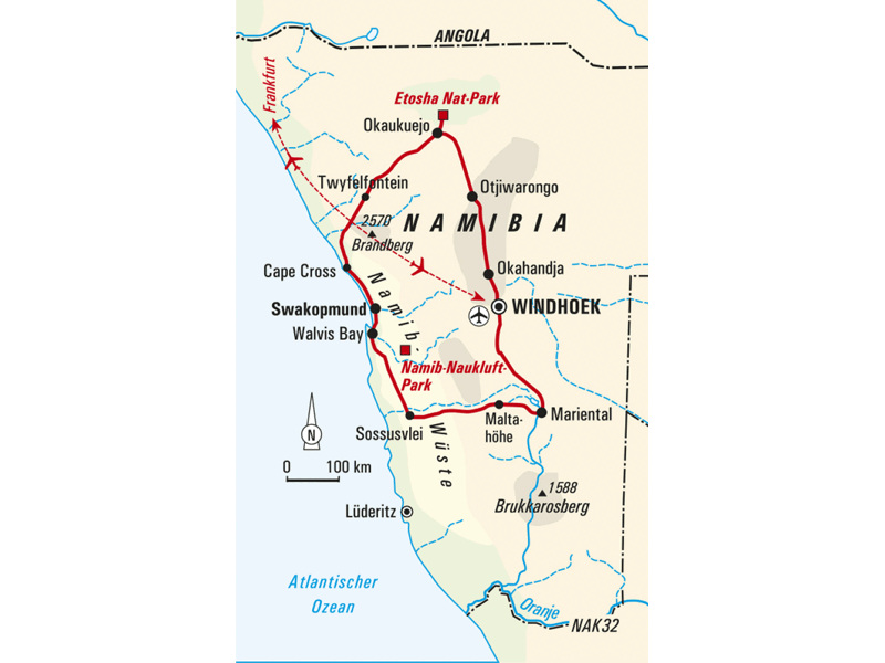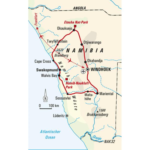 Reise-Nr. St 75AESelbstfahrer-Wanderreise durch die Kalahari-Wüste, Sossusvlei, Swakopmund, Erongo-Gebirge und den Etosha-Nationalpark