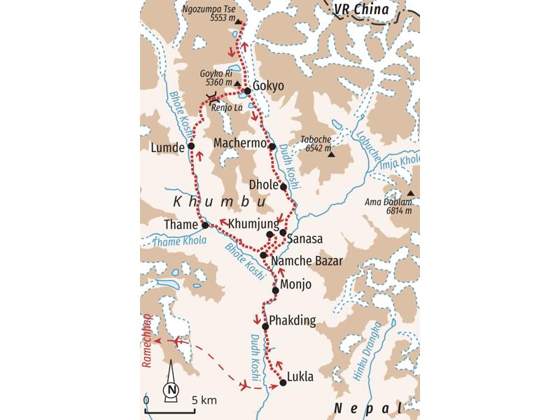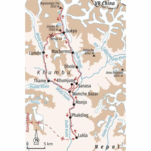 Auf dieser Reise durch das Khumbu-Gebiet stehen der Besuch der Gokyo-Seen und der Ngozumpa Tse, der als Aussichtsgipfel noch als Geheimtipp gilt, im Vordergrund. Als weiteres Highlight wird der Pass Renjo La überschritten. Hinauf zum Pass verläuft die Route durch das beschauliche Bhote Koshi-Tal und von der Alm Gokyo zurück nach Namche Bazar durch das landschaftlich vielfältige Gokyo-Tal. Neben einzigartigen Ausblicken lassen sich auf dem Weg in den zahlreichen Dörfern und Klöstern spannende Eindrücke der buddhistischen Sherpa-Kultur sammeln.