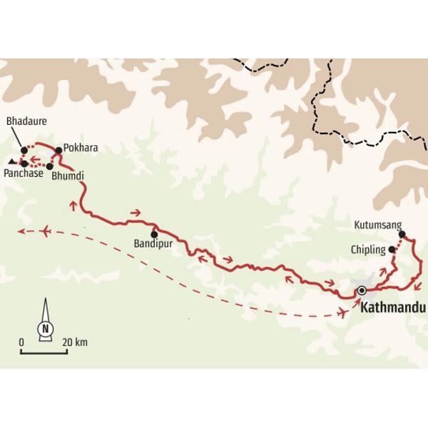 Auf dieser besonders für Nepal- und Trekkingeinsteiger geeigneten Reise besuchen wir mit Helambu und Annapurna gleich zwei Trekkingregionen. Der Fokus liegt auf Einblicken in die landschaftliche und kulturelle Vielfalt des Landes. Vom Aussichtspunkt am Panchase Hill können die Achttausender Dhaulagiri, Annapurna und Manaslu sowie weitere Bergriesen bewundert werden. In der Region Helambu unterstützen wir mit unseren Übernachtungen die Lodges des Projekts „Climate Trek Nepal“.