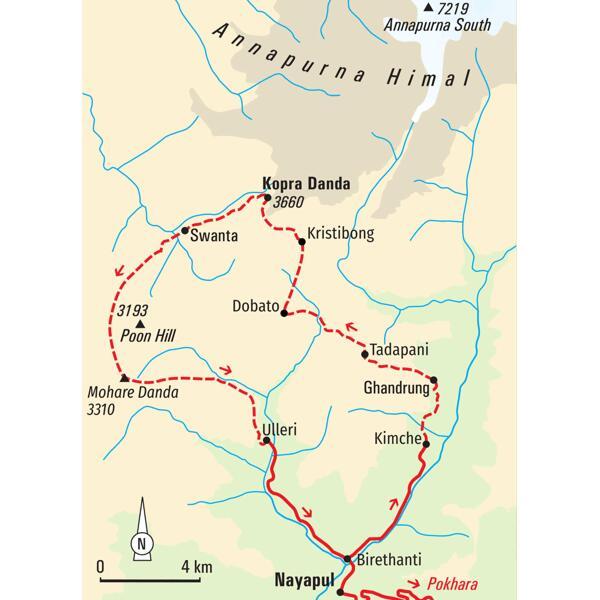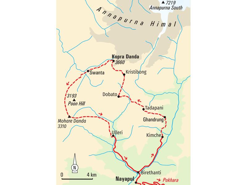 Auf dieser Reise stehen die Ausblicke auf das Dhaulagiri- und das Annapurna-Massiv im Fokus und die Berggipfel präsentieren sich aus unterschiedlichen Blickwinkeln. Die Trekkingetappen sind so gewählt, dass am Nachmittag ausreichend Zeit zur Erholung bleibt. In den kleinen Dörfern des Annapurna-Gebietes lässt sich zudem das ländliche Nepal kennenlernen. Zeit zum Entspannen und zum Besuch von kulturellen Höhepunkten bleibt ebenfalls in den Städten Pokhara und Kathmandu. Die Route führt uns zum Aussichtspunkt Mohare Danda, der weit weniger frequentiert ist als der nahe gelegene und sehr bekannte Poon Hill.