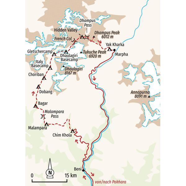 - Die 5.000er-Pässe French Col (5.360 m) und Dhampus La (5.250 m) überschreiten