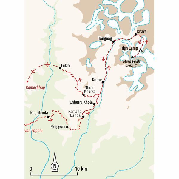 - Beantragung der Genehmigung zur Besteigung des Mera Peak (vor Ort in bar in US-Dollar zu bezahlen zzgl. 2000 NPR Servicegebühr): Frühjahrstermin 350,00 USD, Herbsttermin 175,00 USD