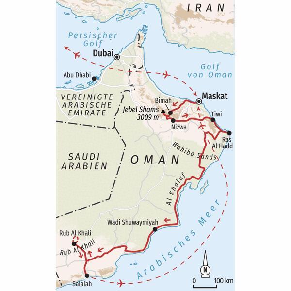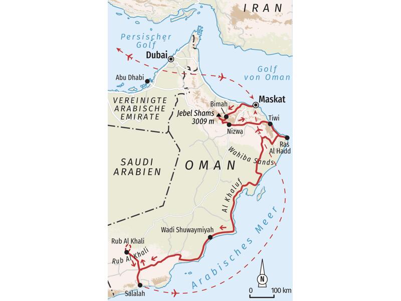 Bei dieser Trekkingreise lernen wir die Höhepunkte des Omans kennen und erkunden auch weniger besuchte Ecken des Landes mit Fokus auf den drei unterschiedlichen Wüsten der Rub Al-Khali, Al-Khaluf und Wahiba Sands. In der südlichen Rub Al-Khali findet ein 3-tägiges Wüstentrekking statt. Neben den Wüstenregionen stehen die Berglandschaften des Hadschar-Gebirges und die Küste am Arabischen Meer und Golf von Oman im Fokus.