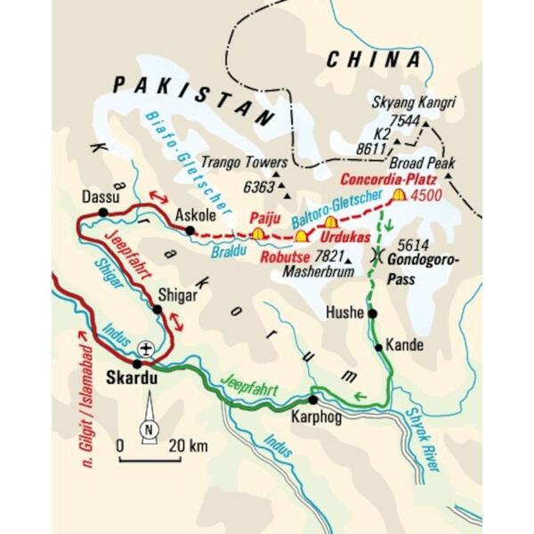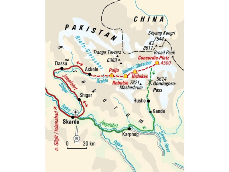 Voraussetzung für diese Reise sind Kondition und Ausdauer für Wanderungen mit bis zu 10 Std. Gehzeit in unwegsamem und steilem Gelände. Für das Trekking zum Concordia-Platz bestehen keine besonderen technischen Anforderungen. Für den seilversicherten Gletscheranstieg zum Pass Gondogoro La ist aber zwingend Erfahrung im Umgang mit Steigeisen, Sitzgurt und Steigklemme erforderlich. Die erforderliche Ausrüstung ist mitzubringen. Der Passübergang kann bei schlechten Bedingungen gesperrt sein. In diesem Fall muss über den bereits bekannten Weg nach Askole zurückgekehrt werden. Wir durchqueren auf der Route unter Umständen Bäche und Flüsse. Dabei steht der Wasserstand normalerweise knietief, nach starken Regenfällen kann er hüfthoch ansteigen. Durch ungünstige Witterungsbedingungen und je nach Kondition der Gruppe können sich die Gehzeiten verlängern, die Trekking-Etappen werden aber regelmäßig durch erholsame Pausen unterbrochen. Extrem hohe Temperaturen bis etwa auf 4000 m Höhe und insbesondere auf den ersten Trekkingetappen auftretender Sandstaub können für zusätzliche Belastung sorgen. Die im Programm angegebenen Höhenunterschiede und Kilometerangaben gelten nur als grobe Richtlinie.