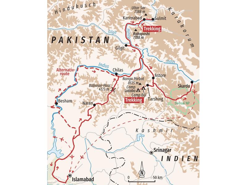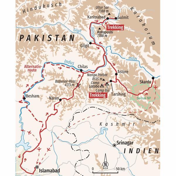Erhaben thront das Baltit-Fort wie ein Adlerhorst über den grün leuchtenden Feldern. Der Palast strahlt in der Oase voller Apfel-, Aprikosen- und Kirschbäumen. Dazwischen wiegen schlanke Pappeln im Wind. Unser Blick schweift über die Dächer von Karimabad und das breite Hunzatal bis hinüber auf die schneebedeckten Bergkuppen und rauen Gletscher. Der mächtige Rakaposhi ragt im Panorama am höchsten auf. Wir befinden uns mitten in der beeindruckenden Gebirgslandschaft Nordpakistans mit seiner enormen Fülle an hohen Gipfeln. Hier treffen die Gebirgsketten Hindukusch, Karakorum und Himalaya aufeinander. Über das Indus-Tal erreichen wir die Region Gilgit-Baltistan, wo wir im Hunzatal das gastfreundliche und weltoffene Volk der Hunzukutz treffen, bekannt als geschickte Bergbauern und Meister im Anlegen von Bewässerungskanälen. Wir wandern hinauf zum Rakaposhi-Basislager, über den Gulkin-Gletscher zum schön gelegenen Borith-See – Blick auf die spektakulären Passu Peaks inklusive – und zu einem Aussichtspunkt über den türkisblauen Attabad-See. Weiter südlich widmen wir uns dem westlichsten Eckpfeiler des Himalayagebirges, dem Nanga Parbat. Von Tarshing im Rupaltal trekken wir über die Gletscher Chhungpar und Bazhin und zu den herrlich gelegenen Zeltplätzen und Basecamps der Herrligkoffer-Expeditionen der 70er und 80er Jahre. Von einem Grat aus bestaunen wir aus nächster Nähe die gewaltige Rupalflanke des Nanga Parbat. Bevor uns ein Flug von Skardu wieder zurück nach Islamabad bringt, wo wir auf dem Basar sicher das ein oder andere Souvenir erstehen können, führt uns eine abenteuerliche Fahrt durch den Deosai-Nationalpark und damit über die zweithöchste Hochebene der Welt. Die bezaubernden Landschaften Nordpakistans werden uns noch lange im Gedächtnis bleiben.