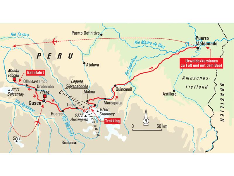 Der Fokus dieser Reise liegt auf dem Trekking von der Cordillera Vilcanota zum Amazonas. Zu Fuß lernen wir die landschaftlichen Gegensätze, unterschiedlichen Klimazonen sowie die Vielfalt und Artenreichtum Südperus kennen.