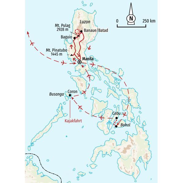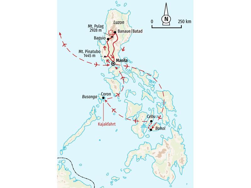 Der Fokus dieser Reise liegt auf der landschaftlichen Vielfalt und der Begegnung mit der Bevölkerung der Pazifikinseln. Hierbei werden bei zwei 3-tägigen Trekkings und weiteren Wanderungen fünf Gipfel bestiegen und dabei unterschiedlichste Landschaftsformen durchwandert, auch die Reisterrassen von Luzon werden zu Fuß entdeckt. Aber auch Zeit am, im und auf dem Wasser darf bei dieser Reise natürlich nicht fehlen und so wird die Tour durch eine Boot-/Kajaktour ergänzt.