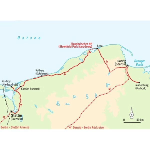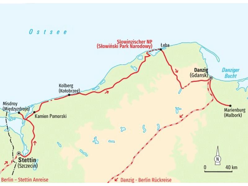 Warmer Wind fegt über den feinen, hellen Sand, die kleinen Körnchen wirbeln durch die Luft und landen ein paar Meter weiter wieder auf den wellenförmigen Dünen. Wir sind in der Sahara – allerdings in der polnischen, mitten in Europa. Die salzige Ostsee-Brise vermischt sich mit dem Duft der Fichten und Kiefern und begleitet uns auf unseren Wanderungen. Wir erklimmen bis zu 50 Meter hohe Wanderdünen, durchstreifen dichte Mischwälder und lassen uns entlang der Steilküste den Wind um die Nase wehen. Aber nicht nur die gegenwärtige Natur, auch die vergangene Kultur der Region zieht uns in ihren Bann. Hinter den sanierten Backsteinfassaden schlummert das Mittelalter, aus den prachtvollen Schlössern spricht die preußische Vergangenheit und in den Hansestädten wird die Geschichte der Kaufleute fast wieder lebendig. Die Ostseefischer sorgen dafür, dass das kulinarische Erbe der Region nicht zu kurz kommt und die regionale, deftige Küche beschert uns tägliche Gaumenfreuden. Wir wollen auch wissen, wo Oskar die Blechtrommel von Günter Grass geschlagen hat und wie die Kaschuben und Slowinzen ihre tief verwurzelten Traditionen in die Moderne integrieren – natürlich immer mit genügend Zeit zum Durchatmen und Genießen.