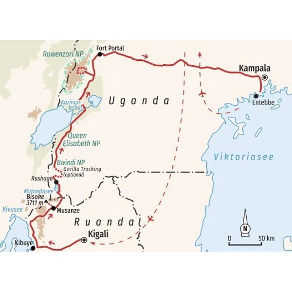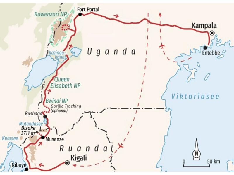 Drei Tage wandern wir tief hinein in das mystisch anmutende Ruwenzori-Gebirge. Das Gebirge, welches auch Wolkenkönig oder Mondberge genannt wird, ist aufgrund seiner Ökologie weltweit einzigartig. Die märchenhafte, sattgrüne Vegetation, die von Gigantismus und endemischen Pflanzen geprägt ist, verzaubert seine Besucher unweigerlich. Wie aus einer anderen Welt scheinen die riesigen Lobelien und silbrig-glänzende Flechten hängen wie Bärte schweigsamer Naturgeister von den Bäumen in dieser neblig-wolkenverhangenen Szenerie. Eingebettet in diese atemberaubende Landschaft liegt auf 3.000 Metern ein malerischer Hochgebirgssee. Vor diesem einzigartigen Highlight unserer Reise haben wir bereits großartige Entdeckungen zwischen Ruanda und Uganda erlebt. Wir queren den Kivu-See, wandern auf dem Kongo-Nile-Trail, bestaunen die Virunga-Vulkane von oben und wandern zu den im Bwindi Nationalpark lebenden Berggorillas - ein Erlebnis, das man nie wieder vergisst. Im berühmtesten Nationalpark Ugandas, dem Queen-Elizabeth-Nationalpark, gehen wir auf Safari und suchen im Schatten der ausladenden Äste der Akazienbäume Elefanten, Büffel, Löwen und Leoparden; auf dem Kazinga-Kanal erleben wir vom Boot aus Flusspferde, Krokodile, Wasserböcke und eine erstaunliche Vogelwelt. Wer möchte kann sein Ostafrika Erlebnis noch um 3 Tage zum Murchison Falls Nationalpark verlängern.