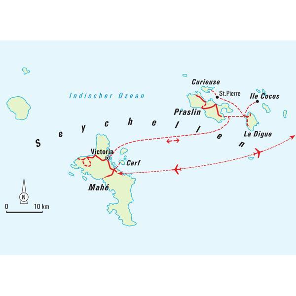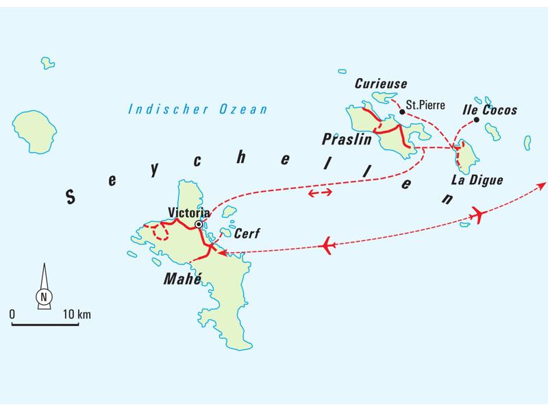 Wir wandern entlang tropisch-grüner Pfade durch das Inselinnere zur Küste, wo die sanften Wellen des türkisfarbenen Indischen Ozeans leise auf den schneeweißen Sandstrand treffen. Formschöne Granitfelsen liegen im Schatten der Palmen. Barfuß spüren wir den weichen Sand unter unseren Füßen, eine leichte Brise mildert die tropische Wärme. Nach der Wanderung erfrischen wir uns im Meer – die Badesachen sind im Rucksack. Auf Mahé, Praslin und La Digue führen uns abwechslungsreiche Wege durch dichte Regenwälder, geschützte Naturparks und artenreiche Schutzgebiete. Wir bestaunen endemische Pflanzen wie die Coco de Mer, die Riesenkokosnuss der Seychellenpalme, kosten süße Früchte und bewundern die bunte Blütenpracht. Am Strand beobachten wir die kreisenden Vögel und freuen uns beim Schnorcheln über die farbenfrohen Fische. Mit etwas Glück sehen wir Wasserschildkröten; Riesenschildkröten an Land begegnen uns sicher. Wir wandern und radeln entlang der Küste und fahren zum Sonnenuntergang mit dem Boot auf das Meer und zu den kleinen Inseln Curieuse und Cousin. Lokale Köstlichkeiten mit saftigem Obst und fangfrischen Meeresfrüchten verwöhnen uns täglich und wir genießen die Traumstrände.