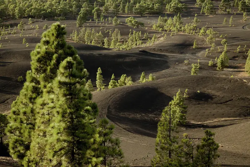Auf ca. 1.400 m Höhe, in der Nähe des Refugio El Pilar, beginnt unsere heutige Wanderung entlang des Höhenrückens Cumbre Vieja. Vor uns reihen sich die Vulkankegel wie an einer Kette auf und wir folgen ihr Richtung Süden. Zunächst umrunden wir den Pico Birigoyo und lichte Kiefernwälder und Ginsterbüsche sorgen für grüne Farbtupfer in der kargen Lavalandschaft. Zwischen dem Krater Del Hoyo Negro und dem Pico Nambroque schlängelt sich unser Pfad im Auf und Ab weiter und bietet uns eine herrliche Aussicht über die West- und Ostküste La Palmas mit ihren Bananenplantagen und kleinen Dörfern. Wir passieren das Lavafeld La Malforada und den Hauptgipfel des Vulkans Deseada. Von nun an geht unser Weg stetig bergab bis wir die Häuser von Fuencaliente erblicken. Dort holt uns der Bus ab und wir fahren zurück nach Los Llanos.