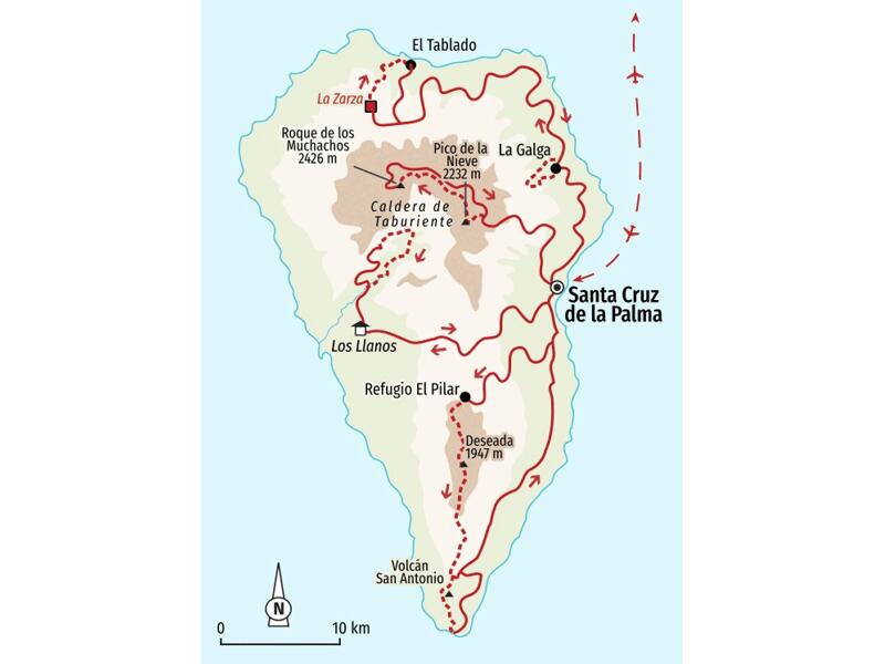 Ein Wolkenbett breitet sich unter uns aus. Dazwischen blitzt das azurblaue Meer hindurch. Der Lavasand leuchtet in dunklen und braunen Tönen und knirscht unter den Schuhen. Im Süden ein Relief aus schwarz-roten Vulkankegeln und tiefen Erdspalten, umrahmt von Bananenplantagen und hellgrünen Kiefern. Im Norden ein riesiger Krater, dichte Lorbeerwälder und weiße Häuschen, eingebettet in terrassierte Gärten. Urkräfte gaben La Palma ihr einzigartiges Gesicht, durchzogen von abwechslungsreichen Wanderwegen voller "Höhen" und "Tiefen" und versteckten kleinen Pfaden für Entdecker! Wir folgen der Vulkankette und den Lavafeldern entlang der Cumbre Vieja und steigen ab zu den Leuchttürmen am Südzipfel der Insel. Im Norden warten die typischen "Barrancos", tiefe von üppiger Vegetation durchzogene Schluchten und abgeschiedene Weiler hoch über den Klippen auf uns. Noch gewaltiger war die Natur in der Caldera de Taburiente am Werk: Wir wandern durch den Krater hindurch, der von Vulkankegeln umzingelt ist. Dabei stoßen wir auf unzählige Quellflüsschen und Wasserfälle. Das Kontrastprogramm dazu ist der Höhenweg vom Pico de la Nieve zum Roque de los Muchachos – ein Rundum-Panorama vom Feinsten. Für Kulturgenuss sorgt die koloniale Altstadt von Santa Cruz. Jeder Schritt durch die gepflasterten Gassen ist ein Schritt durch die Vergangenheit. Ruhe und Erholung finden wir an den schwarzen Lavastränden.