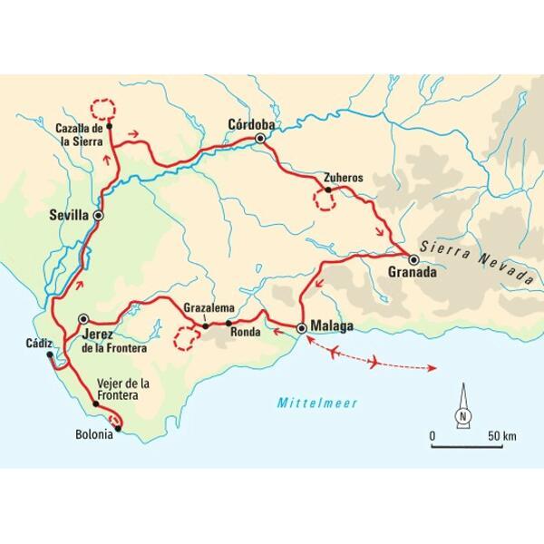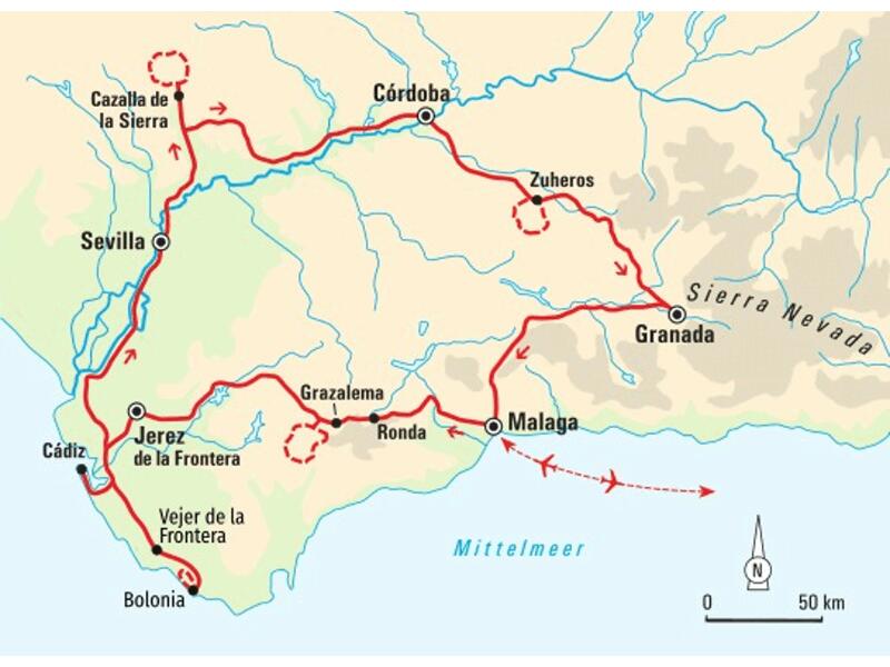 Karstige Hochebenen, schattenspendende, uralte Kork- und Steineichen, kalkweiße Dörfer und bunte Städte. Dazu eine Prise andalusischer Köstlichkeiten und schon verwandelt sich der Süden Spaniens zu einer unwiderstehlichen Mischung. Cádiz, Sevilla, Córdoba und Granada, römische Tempel, Moscheen, Synagogen und Kirchen – ungeachtet des kulturellen und architektonischen Potpourris weht der Duft von Orangenblüten unermüdlich durch die Gassen. Vor allem die alten Städte sind erfüllt von Leben und das fröhliche Treiben ist geradezu ansteckend. Musik liegt in der Luft. Wir bewundern den mächtigen Alcazar von Sevilla, erklimmen den Burgberg der Alhambra von Granada und atmen die Geschichte im Säulenwald der Moschee-Kathedrale von Córdoba. Und auch die Natur zeigt uns ein märchenhaftes Spektrum der Gegensätze: Das romantische Ronda thront hoch über der mächtigen Schlucht El Tajo. Vom römischen Baelo Claudia gehen wir am Strand über die Düne von Bolonia und spüren die Nähe Afrikas. In den üppig-grünen Bergen der Sierra de Grazalema erwartet uns eine einzigartige Pflanzenwelt. Wir wandern durch beschauliche Naturparks, erkunden quirlige Städte und bummeln durch kleine Dörfer, in denen sich Häuser wie Bauklötze übereinander stapeln. Wir streifen durch schattige Wälder und schnuppern ein bisschen Meeresluft. Dazu noch einen Sherry an der Bar, Flamenco auf der Straße und Tapas in den Bodegas - Andalusiens Traumkulisse steckt voller Kontraste!