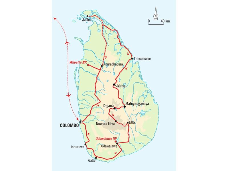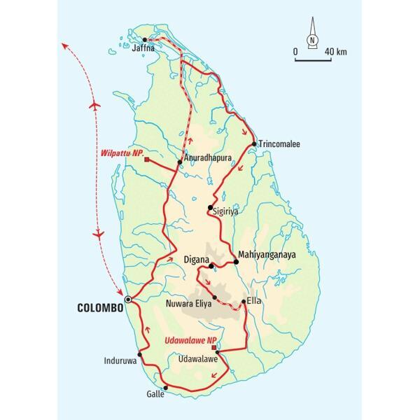Gleichmäßig schlägt der Gong und ruft monoton die Mönche zum Gebet. Im dichten Grün des Dschungels wird es plötzlich bunt. Knallorange Gewänder tauchen zwischen den antiken Mauern auf, gelbe und rote Schirme leuchten zwischen den Bäumen und schützen die Betenden vor der Kraft der Sonne. Die schneeweiße Kuppel wirkt in dieser tropischen Umgebung wie ein gestrandetes Raumschiff aus einer fernen Galaxie. Dabei ist sie das ganz und gar nicht, vielmehr ein fest verwurzeltes, irdisches Meisterwerk der Architektur. Die Ruwanwelisaya Dagoba thront seit vielen Jahrhunderten auf ihrem Sockel in Anuradhapura und lässt sich auch durch das tägliche Gewusel der Pilger nicht erschüttern. Und wir auch nicht - wir erkunden die ehemaligen Königsstädte Anuradhapura und Polonnaruwa im Zentrum der Insel, wandern durch die Teeplantagen im bergigen Hochland von Nuwara Eliya und streifen durch den Eisenwald des Klosters Na Uyana. Wir lernen die Wolkenmädchen von Sigiriya kennen, lüften das Geheimnis von Buddhas oberem Eckzahn in Kandy, kochen in Jaffna mit einer tamilischen Familie ein echtes Curry und lauschen den alten Lieder einer Korbweberin in Mahiyanganaya. Im Wilpattu-Nationalpark begeben wir uns auf Leopardenpirsch und bei Thiriyay halten wir Ausschau nach wilden Elefanten – spielende Äffchen auf der Straße gehören zum Alltag Sri Lankas. Und zwischendrin winden wir uns mit dem Zug zusammen mit den Einheimischen durch grüne Hügel und Teeplantagen von Nuwara Eliya nach Ella. Kaum ein anderes Land der Erde bietet eine solche Abwechslung auf so kleinem Raum.
