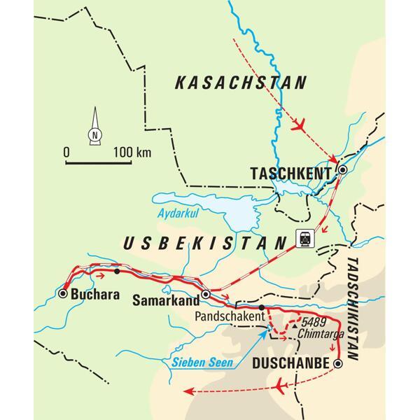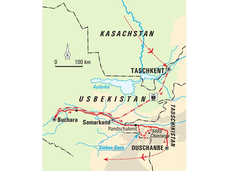 Während der erste Teil der Reise den märchenhaften Städten Buchara und Samarkand und dem kulturellen Erbe der Seidenstraße vorbehalten ist, führt im zweiten Teil ein abenteuerliches Trekking zu den farbenprächtigen Hochgebirgsseen und der einmaligen Natur im Fan-Gebirge, bei dem auch genug Zeit bleibt um die dort lebenden Menschen und deren Alltag kennenzulernen.