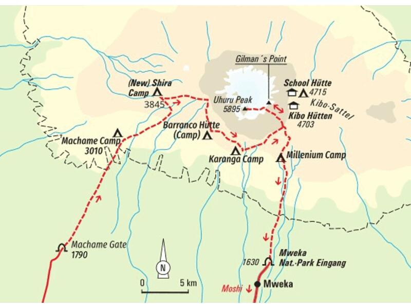 Natur und Höhe atemberaubend - die Route anspruchsvoll und abwechslungsreich. Die Machame-Route hat sich in den vergangenen Jahren zur beliebtesten Route am Kilimanjaro etabliert. Die Erfolgschancen den Uhuru Peak zu erreichen sind dank des Höhenprofils sehr gut. Durch dichten Regenwald starten wir das Abenteuer Kilimanjaro. Moos hängt von den Bäumen, am Wegrand leuchtet das Kilimanjaro-Springkraut und über unseren Köpfen springen Mantelaffen in den dichten Baumwipfeln umher. Nebel zieht hinauf in die mystischen Moorlands, wo die berühmten Riesensenecien bis in einer Höhe von 4.500 m wachsen. Nach der technisch einfachen Kraxelei an der Great Barranco Wall werden wir mit einem einmaligen Ausblick auf den Gipfelaufbau des Kibo und die südlichen Gletscher belohnt. In Richtung Südwesten spitzt der Mount Meru aus den Wolken hinaus. Am Southern Circuit gewöhnen wir uns im stetigen Auf und Ab an die Höhe. Um unsere Akklimatisierung zu verbessern, legen wir eine zusätzliche Nacht auf 4.000 m im Karanga Camp ein und können so gestärkt in die Gipfeletappe starten. Der letzte Aufstieg ist lange und mühsam, umso mehr sind wir mit Stolz und purem Glück erfüllt, wenn wir schließlich ganz oben sind und die aufgehende Sonne uns Kraft spendet... Die auch als Whiskey-Route bekannte Variante ist eine konditionell fordernde Tour die über abwechslungsreiche Pfade durch die landschaftlich schönsten Ecken des Kilimanjaro-Massivs zum weißen Dach Afrikas führt.