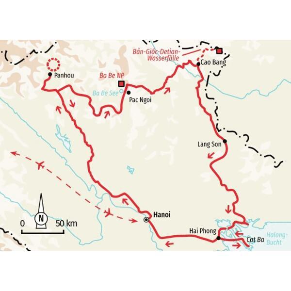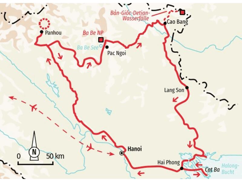 Dichter Dschungel, sattgrünes Blätterdach und die Stille der Natur umgeben uns – doch es dringt noch ein anderes Geräusch zu uns durch, mit jedem Schritt hören wir es immer deutlicher, langsam lichtet sich der Wald und die Pflanzen geben den Blick frei auf rauschende Wassermassen die sich über mehrstufige Kaskaden ergießen: den beeindruckenden Bản-Giốc-Fällen. Umgeben von Reisfeldern und direkt an der chinesischen Grenze entdecken wir dieses abgelegene Juwel Vietnams. Neben der wuchernden Natur, den in steile Berghänge gebauten Reisterrassen und den tosenden Wasserfällen sind es vor allem die Menschen, die diese Region so besonders machen. Immer wieder tauchen wir tief ein in die Kultur und das Leben der verschiedenen Bergvölker. Wir sind zu Gast bei den Hmong und Dao, übernachten in traditionellen Stelzenhäusern und haben die Möglichkeit bei der Zubereitung der traditionellen Gerichte über die Schulter unserer Gastgeber zu blicken. Wir wandern im äußersten Nordosten des Landes bis zur chinesischen Grenze, trekken in der entlegenen Region Hoang Su Phi von Dorf zu Dorf und folgen schmalen Pfaden durch die Kalksteinlandschaft von Cao Bang. Mit dem Kajak erkunden wir die größte Insel der Halong-Bucht und per Boot gleiten wir über den mystischen Ba Ba See. Leuchtend grüner Bambuswald, goldgelbe Reisterrassen und farbenfrohe Trachten - mindestens genauso bunt und abwechslungsreich werden auch unsere Erinnerungen an diese Reise sein.