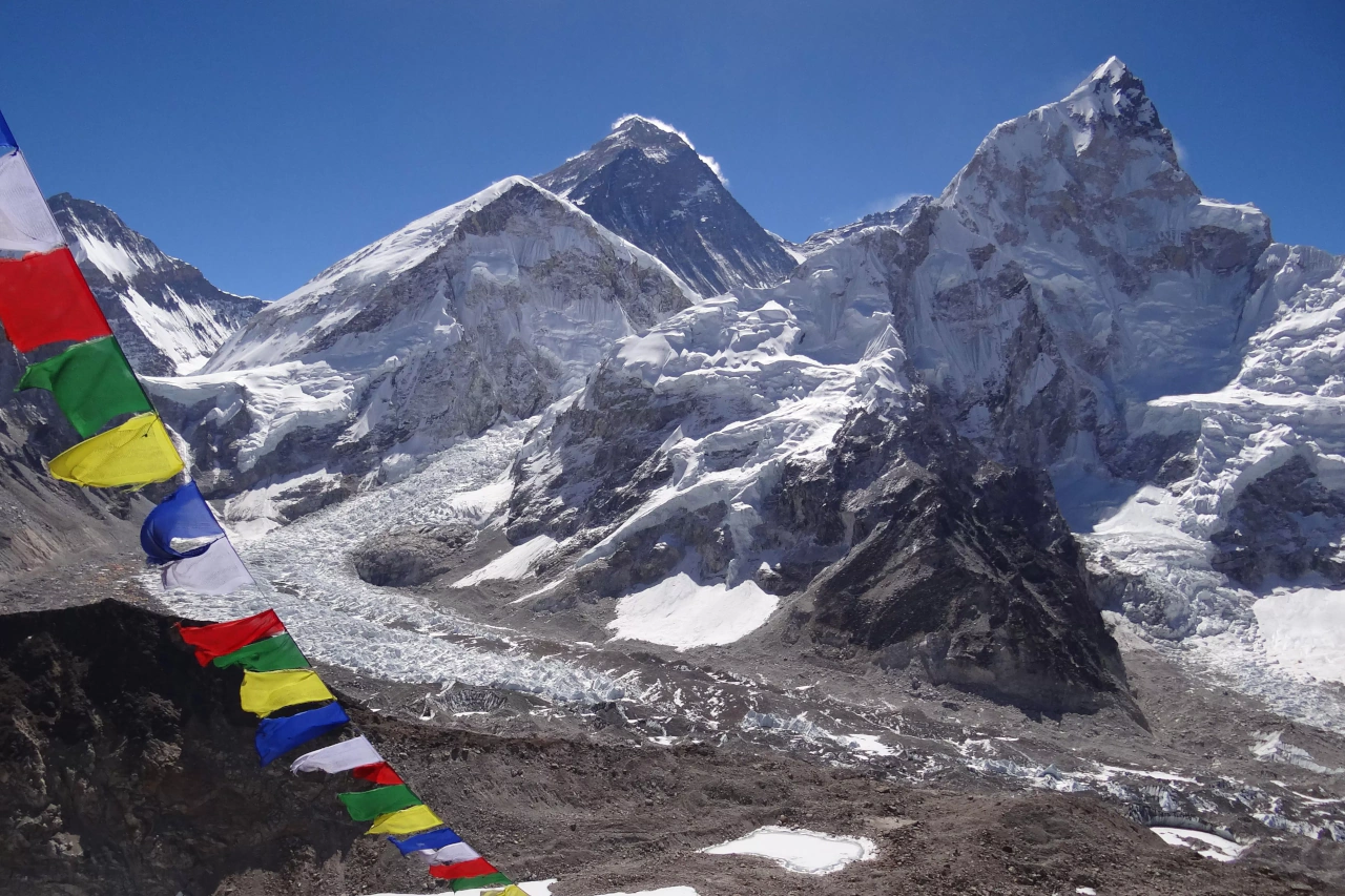 Der Mount Everest, mit beeindruckenden 8.848 Metern der höchste Berg der Welt, thront majestätisch im Himalaya in der Khumbu-Region. Der Mt. Everest erstreckt sich entlang der Landesgrenzen zwischen Nepal und Tibet und ist sowohl in Nepal als Sagarmatha („Stirn des Himmels“) als auch im Tibetischen als Qomolangma („Mutter des Universums“) bekannt. Damit besitzt der berühmteste aller Berge nicht nur eine geografische Bedeutung, sondern auch eine tiefe religiöse Bedeutung für die einheimischen Sherpas. Der Mount Everest ist zugleich Namensgeber für den Sagarmatha-Nationalpark, der sich im Nordosten Nepals über eine Fläche von 1.148 km² erstreckt. Die Landschaft ist geprägt durch die beeindruckenden Gebirgsformationen, Sherpa-Dörfer wie z.B. Namche Bazar, buddhistischen Klöster und natürlich dem Blick auf die vier Achttausender Mt. Everest, Lhotse, Cho Oyu und Makalu.
