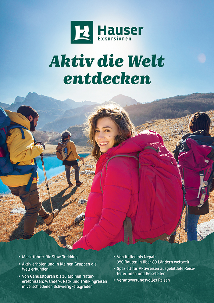 Seit 1973 erkunden Outdoor-Begeisterte mit Hauser Exkursionen Landschaften und Kulturen rund um den Erdball. Bei jeder der 350 Touren in über 80 Länder steht der respektvolle Umgang mit Mensch und Natur im Vordergrund. So lebt der deutsche Slow-Trekking-Marktführer diese Philosophie wie kaum ein anderer Anbieter. Langjährige Partnerschaften vor Ort, familiengeführte Unterkünfte mit regionaler Küche sowie die Ausbildung lokaler Guides zu Hauser-Reiseleiterinnen und -Reiseleitern bilden den Grundstein für ein Erlebnis, das sich vom industriell geprägten Tourismus abhebt. Internet: www.hauser-exkursionen.de